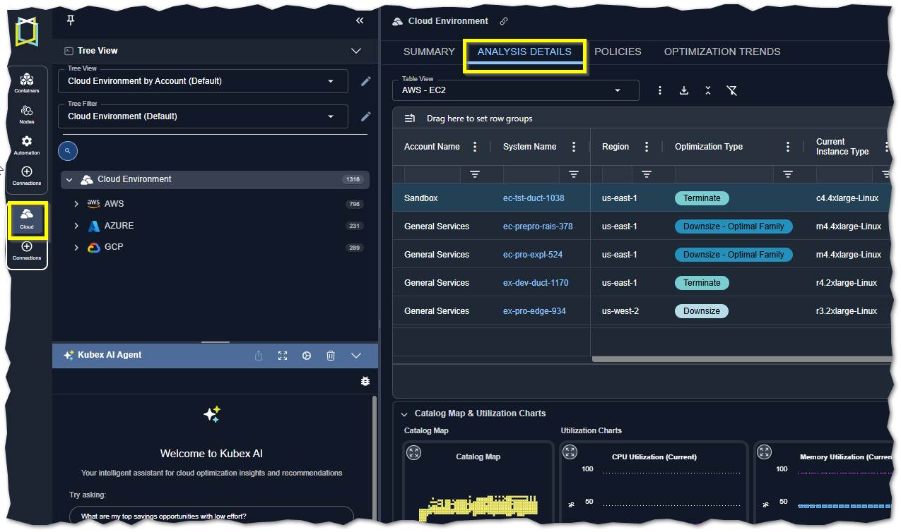 - Utilization Charts—Based on the system selected in the top pane, the corresponding utilization charts are shown in the lower pane. See Analysis Details Utilization Charts for details on expanding, configuring and interpreting the utilization charts