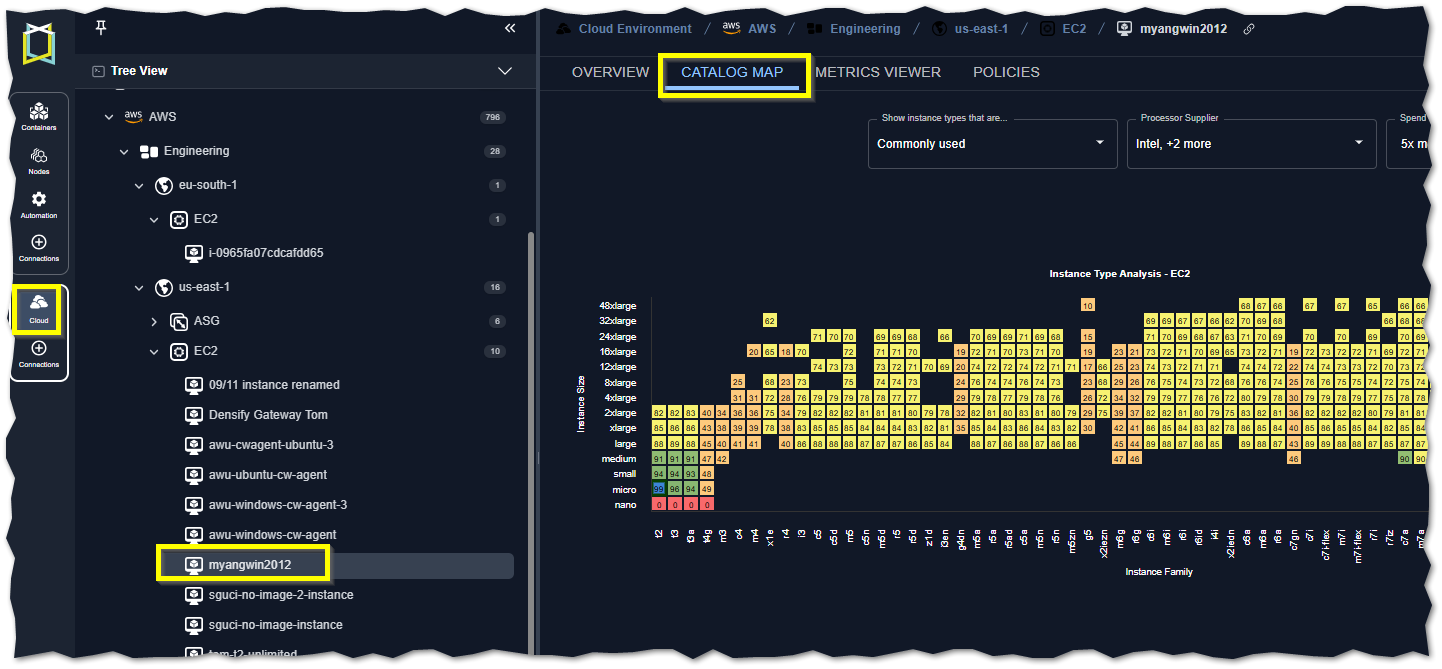 The catalog map is displayed only when a single AWS and Azure cloud instance is selected in the tree viewer.
