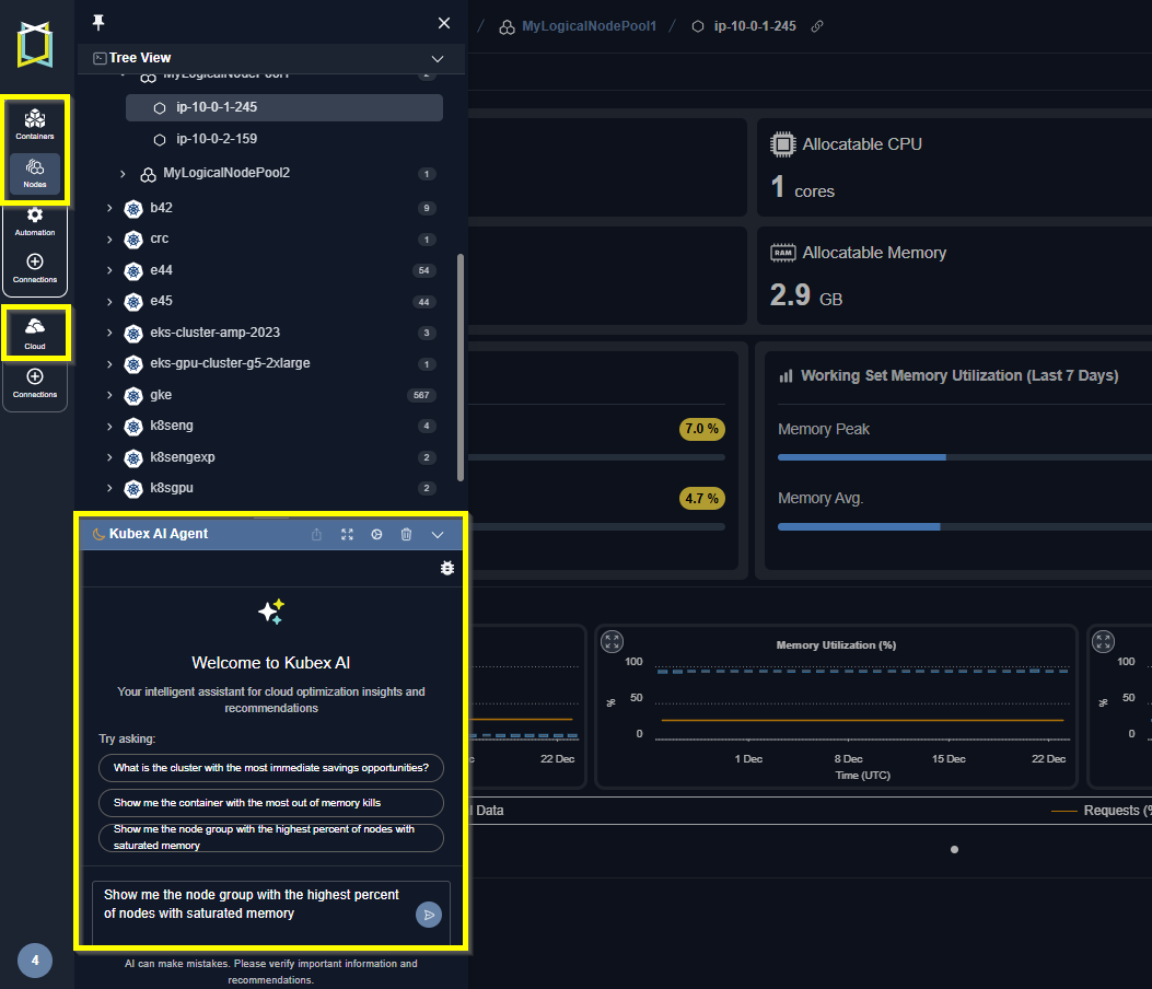 Simply ask questions about your Kubernetes environment in plain English. The AI Agent understands context and can help you:- Find specific information about your clusters, nodes, or containers