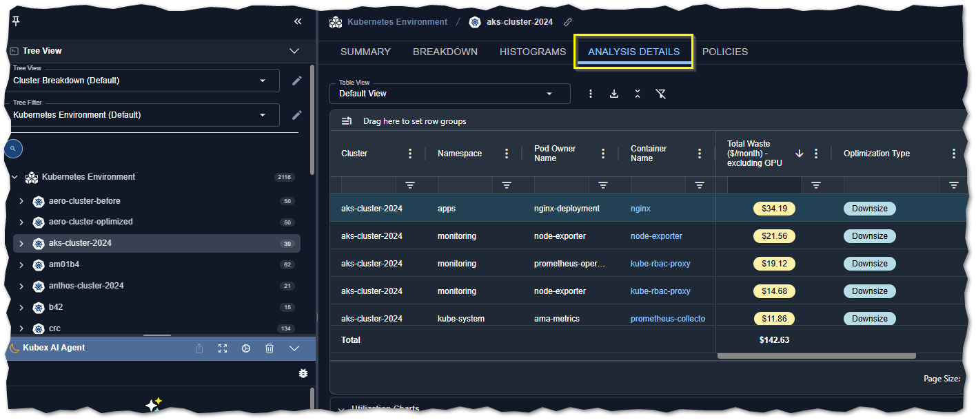 - Utilization Charts—Based on the system selected in the top pane, the corresponding utilization charts are shown in the lower pane. See Analysis Details Utilization Charts for details on expanding, configuring and interpreting the utilization charts