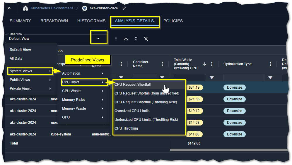 | CPU Waste | CPU Request Surplus | This view highlights containers identified with surplus CPU request settings. |