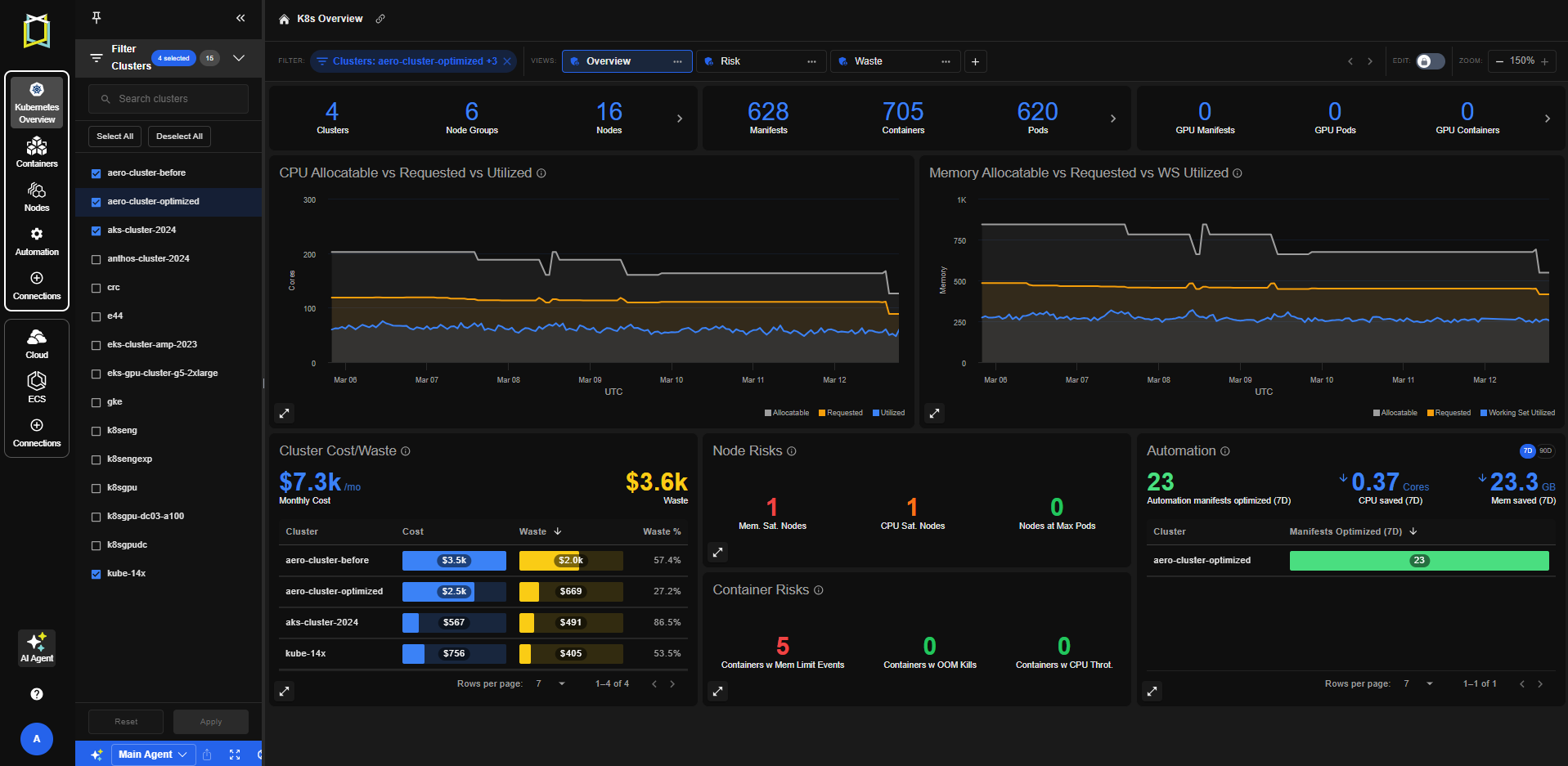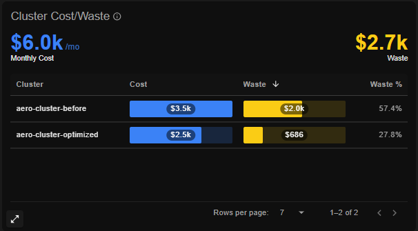 - Waste % – Percentage of cluster cost that is inefficiently used