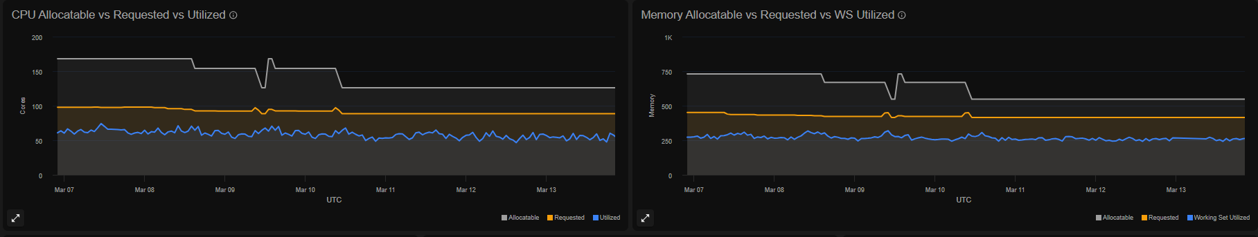 CPU Allocatable vs Requested vs Utilized This chart compares the allocatable CPU/Memory with what is being requested and the actual usage over time.