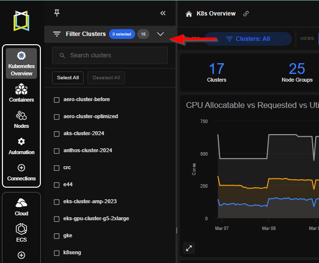 The Cluster Filter on the left side panel allows users to select which clusters are included in the dashboard. By default all clusters are included.