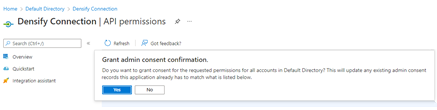 - Click Add Permissions and choose Grant admin consent confirmation. Then click ‘Yes’ when prompted.