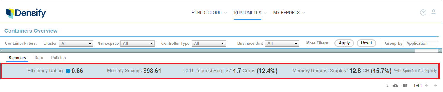 The summary overview provides a number of charts and tables to show you potential savings in your container environments.Summary Bar