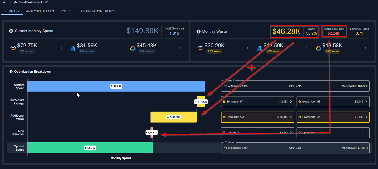 - By displaying ‘waste’ and ‘cost of risk removal’ as separate metrics, users can better understand each savings opportunity.